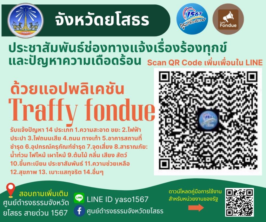 ประชาสัมพันธ์ช่องทางการแจ้งเรื่องร้องทุกข์และปัญหาความเดือดร้อนของประชาชนผ่านแอปพลิเคชั่น Traffy Fondue วันศุกร์, 23 กันยายน 2565 09:53 Print Email ประชาสัมพันธ์ช่องทางการแจ้งเรื่องร้องทุกข์และปัญหาความเดือดร้อนของประชาชนผ่านแอปพลิเคชั่น Traffy Fondue จังหวัดยโสธร back to top