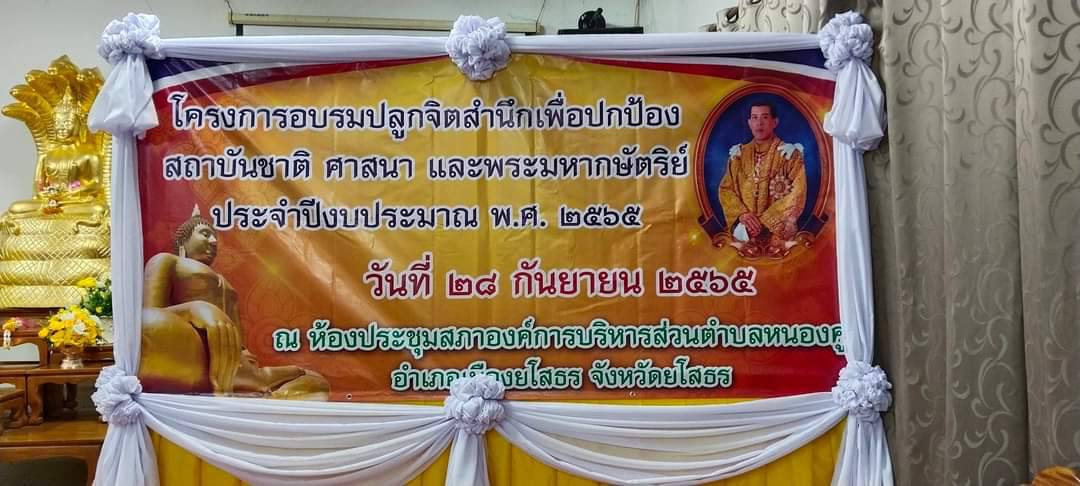 วันพฤหัสบดี, 06 ตุลาคม 2565 14:42วันที่ 28 กันยายน 2565 องค์การบริหารส่วนตำบลหนองคู ได้ดำเนินโครงการอบรมปลูกจิตสำนึกเพื่อปกป้องสถาบันชาติศาสนาและพระมหากษัตริย์ ประจำปีงบประมาณ พ.ศ.2565 ผู้เข้าร่วมโครงการประกอบด้วย ผู้บริหารท้องถิ่น สมาชิกสภาองค์การบริหารส่วนตำบลหนองคู พนักงานส่วนตำบล ครู และพนักงานจ้าง ณ ห้องประชุมสภาองค์การบริหารส่วนตำบลหนองคู อำเภอเมืองยโสธร จังหวัดยโสธร