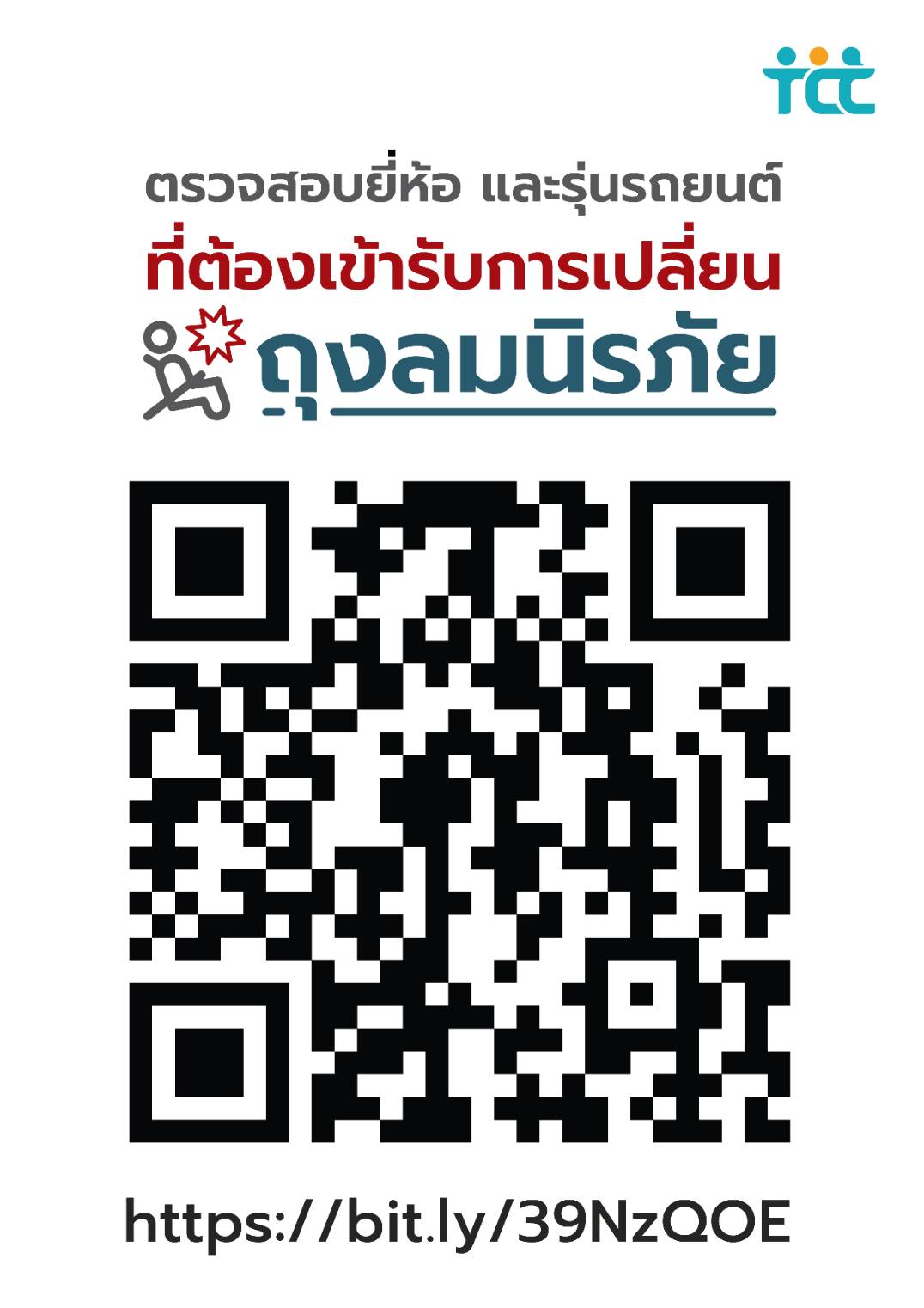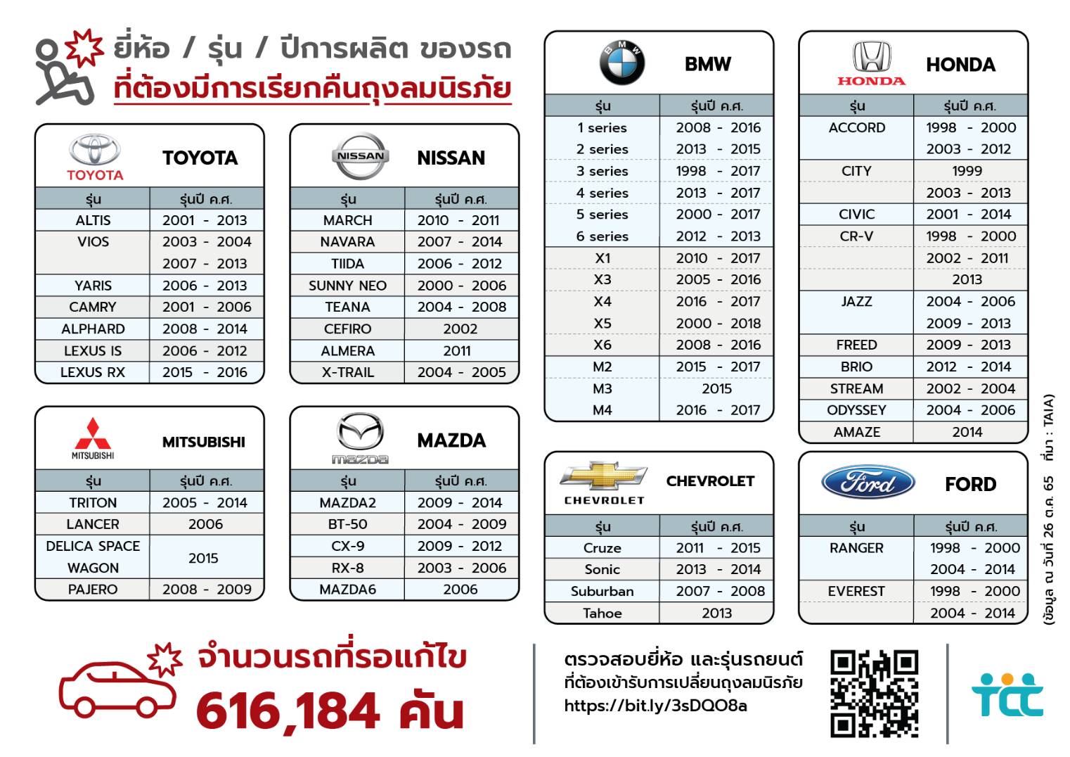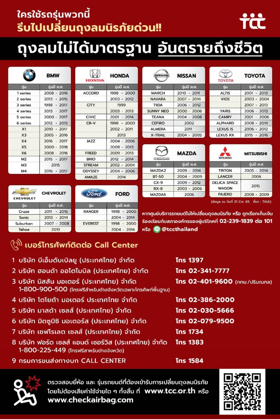 เพื่อความปลอดภัยของประชาชนผู้ใช้รถใช้ถนนเป็นสำคัญ จึงขอประชาสัมพันธ์ให้ประชาชนและเจ้าของรถยนต์รุ่นที่เข้าข่ายต้องเข้ารับการเปลี่ยนถุงลมนิรภัยดังกล่าว
