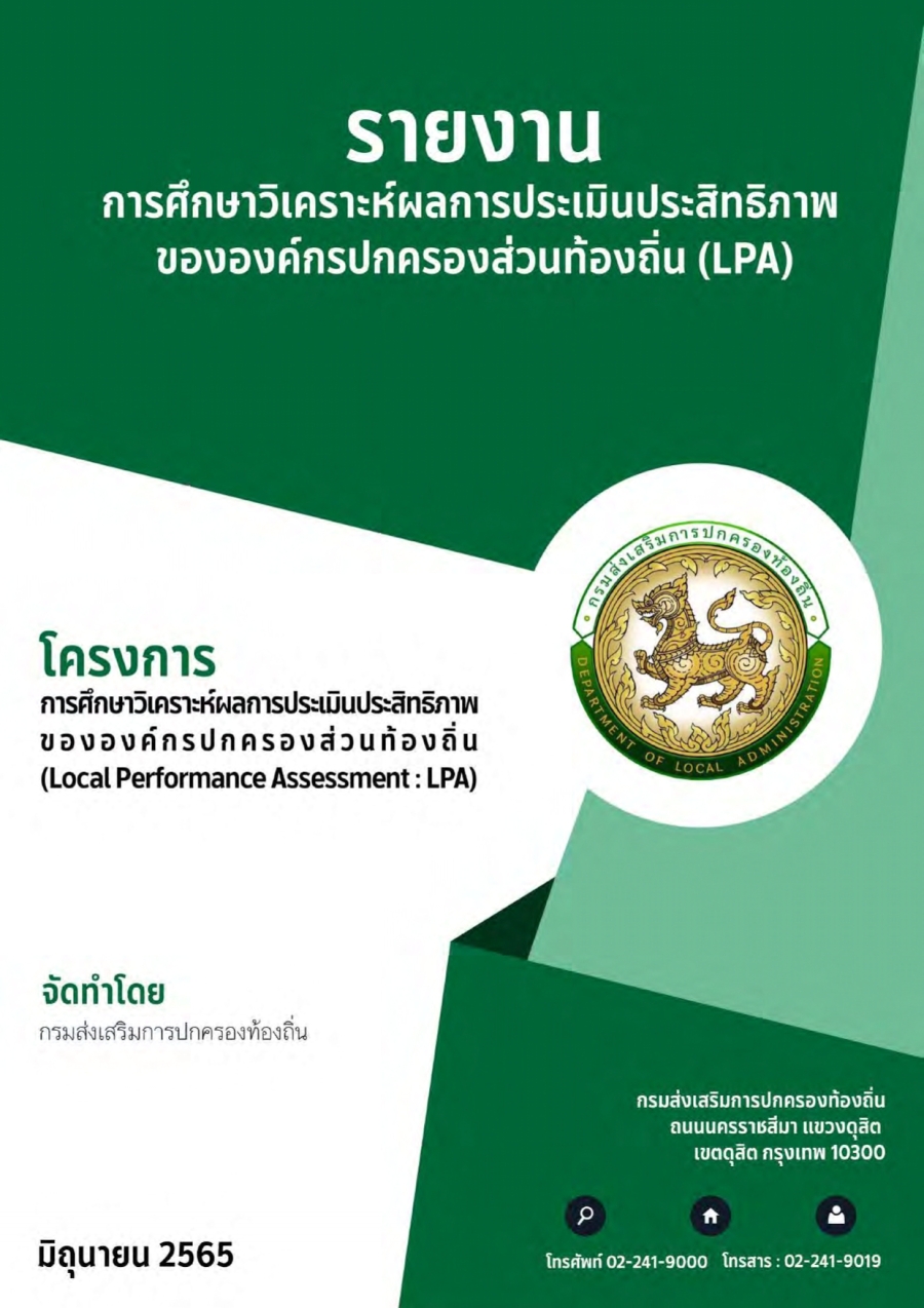 รายงานการศึกษาวิเคราะห์ผลการประเมินประสิทธิภาพขององค์กรปกครองส่วนท้องถิ่น (Local Performance Assessment : LPA) ประจำปี 2564 วันพฤหัสบดี, 12 มกราคม 2566 10:28 Print Email ดาวน์โหลดเอกสาร รายงานการศึกษาวิเคราะห์ผลการประเมินประสิทธิภาพขององค์กรปกครองส่วนท้องถิ่น (Local Performance Assessment : LPA) ประจำปี 2564 (235 Downloads) รายงานความพึงพอใจของประชาชนต่อการจัดบริการสาธารณะขององค์กรปกครองส่วนท้องถิ่น ประจำปี 2565 (264 Downloads) back to top